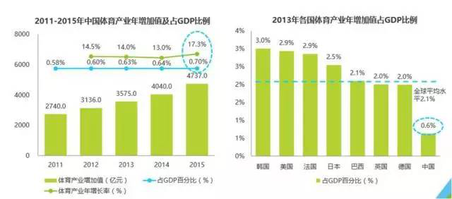 2015年,我国体育总产值1.8万亿元,产业增加值占当年GDP比为0.7%,远低于同期美国水平(3%) 及全球平均水平(2.1%)。 中国体育产业增加值占GDP比重很低,欧、美、日等发达国家体育 产业GDP占比是中国的3-4倍,因此国内体育产业未来增加值仍有较大提升空间。