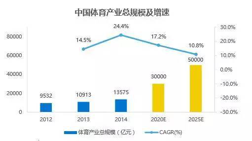 自2006年《体育事业“十一五”规划》后,我国不断向体育强国的目标迈进,近些年,随着相关体育领域“去监管化”的政策红利不 断推出并逐步弱化政府干预力度,体育赛事运作不断向市场化进步。国务院于2014年 出台的46号文明确提出了2025年实现5万亿体育市场总规模的目标, 体育产业迎来爆发已成定局。