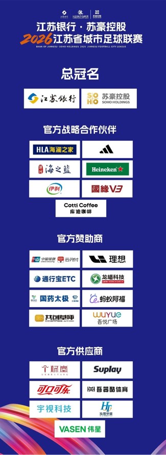 江苏银行、苏豪控股双冠名 2026年“苏超”24家赞助商公布1月27日下午,江苏省城市足球联赛(简称“苏超”)商务合作发布会在南京举行。发布会上,赛事组委会集中发布了2026赛季“苏超”主要商务合作伙伴及相关合作内容。本季“苏超”迎来江苏银行、苏豪控股双冠名加持,国缘 V3、海澜之家、海之蓝、蚂蚁阿福、伊利等 24 家品牌联袂组成赞助矩阵,赛事商业生态再迎升级。