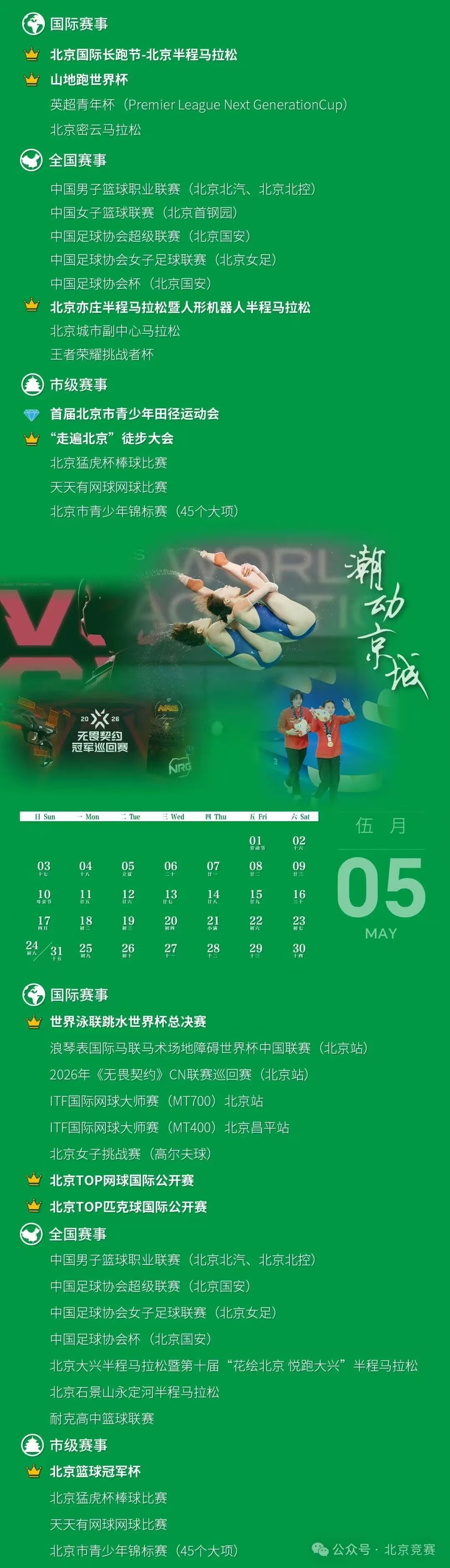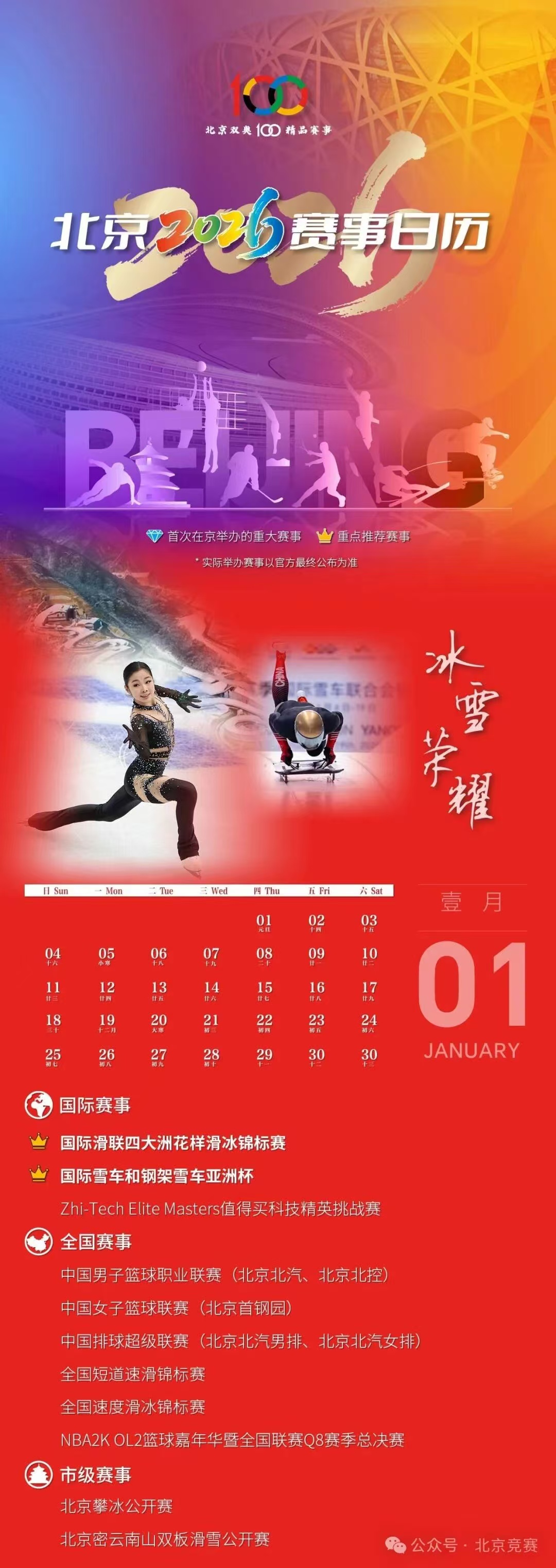 2026年全年北京计划举办各级各类体育赛事千余项,其中纳入“双奥100”赛事体系的精品赛事达206项。在2025年的基础上对赛事体系进一步丰富完善,重点赛事范围涵盖“633”战略项目、传统优势项目、冬季奥运项目和新兴时尚项目,重点赛事场馆辐射全市各区,结合区域特色精准项目布局,持续推动奥运场馆饱和利用和边际效益,延续了“周周有赛事、月月有亮点、季季有精彩”的规划理念,重点赛事贯穿一年四季,比赛日深度绑定节假日、寒暑假,最大限度发挥比赛日经济和假日经济的叠加放大作用。